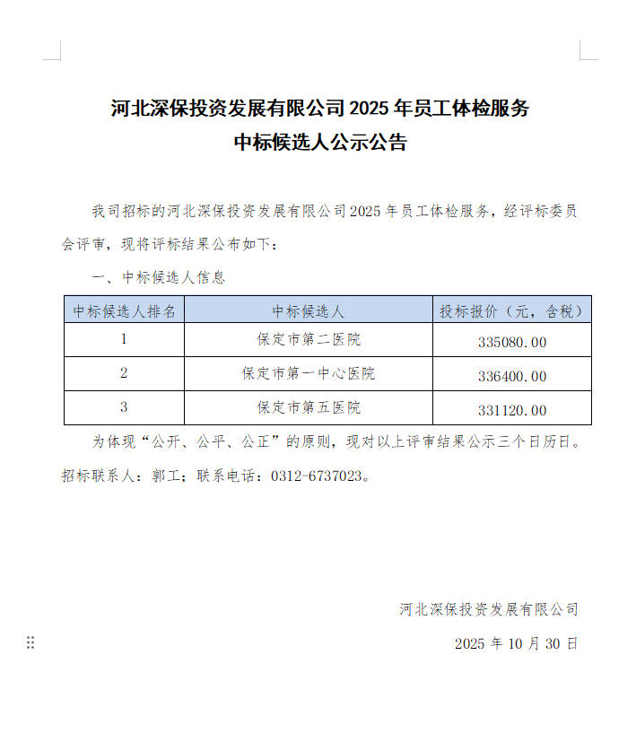 河北深保投资发展有限公司2025年员工体检服务中标候选人公示公告
