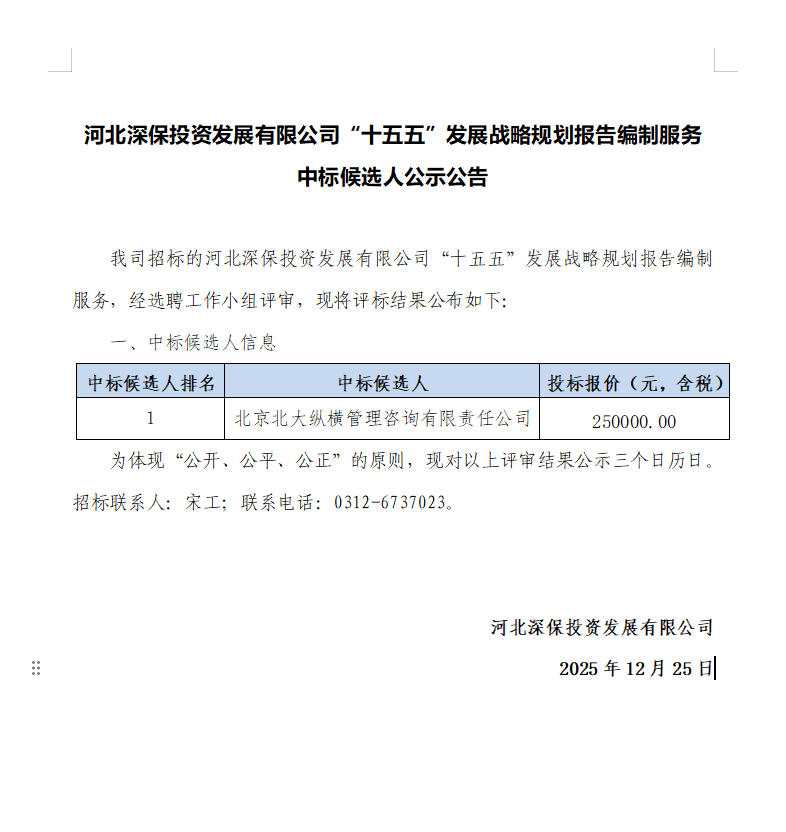河北深保投资发展有限公司“十五五”发展战略规划报告编制服务中标候选人公示公告