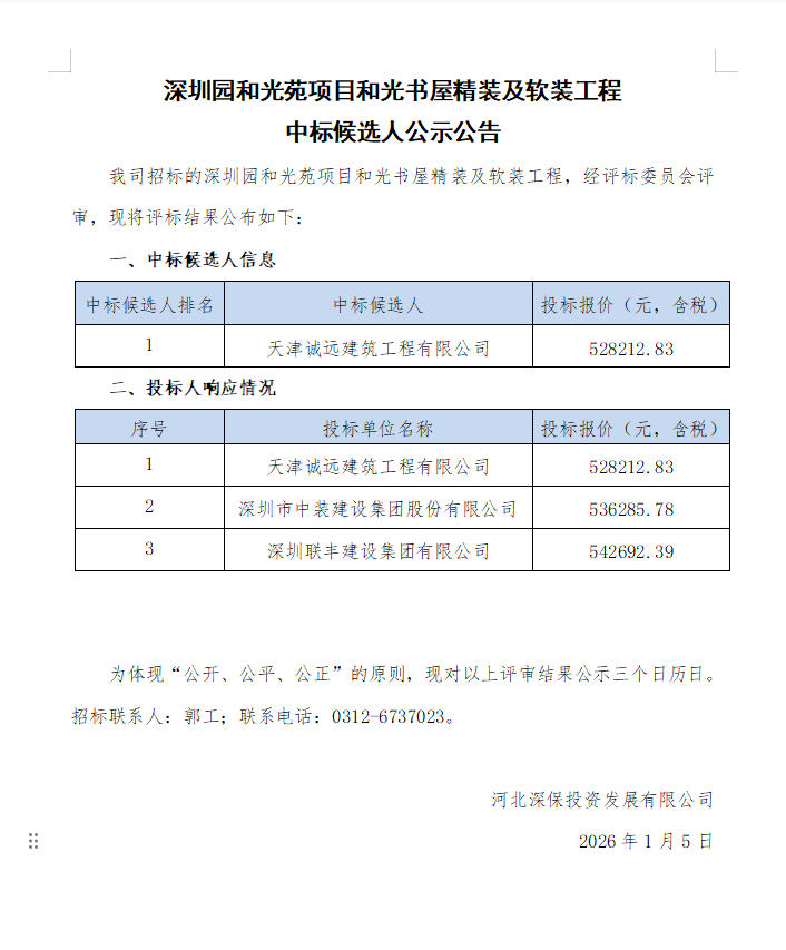 深圳园和光苑项目和光书屋精装及软装工程中标候选人公示公告